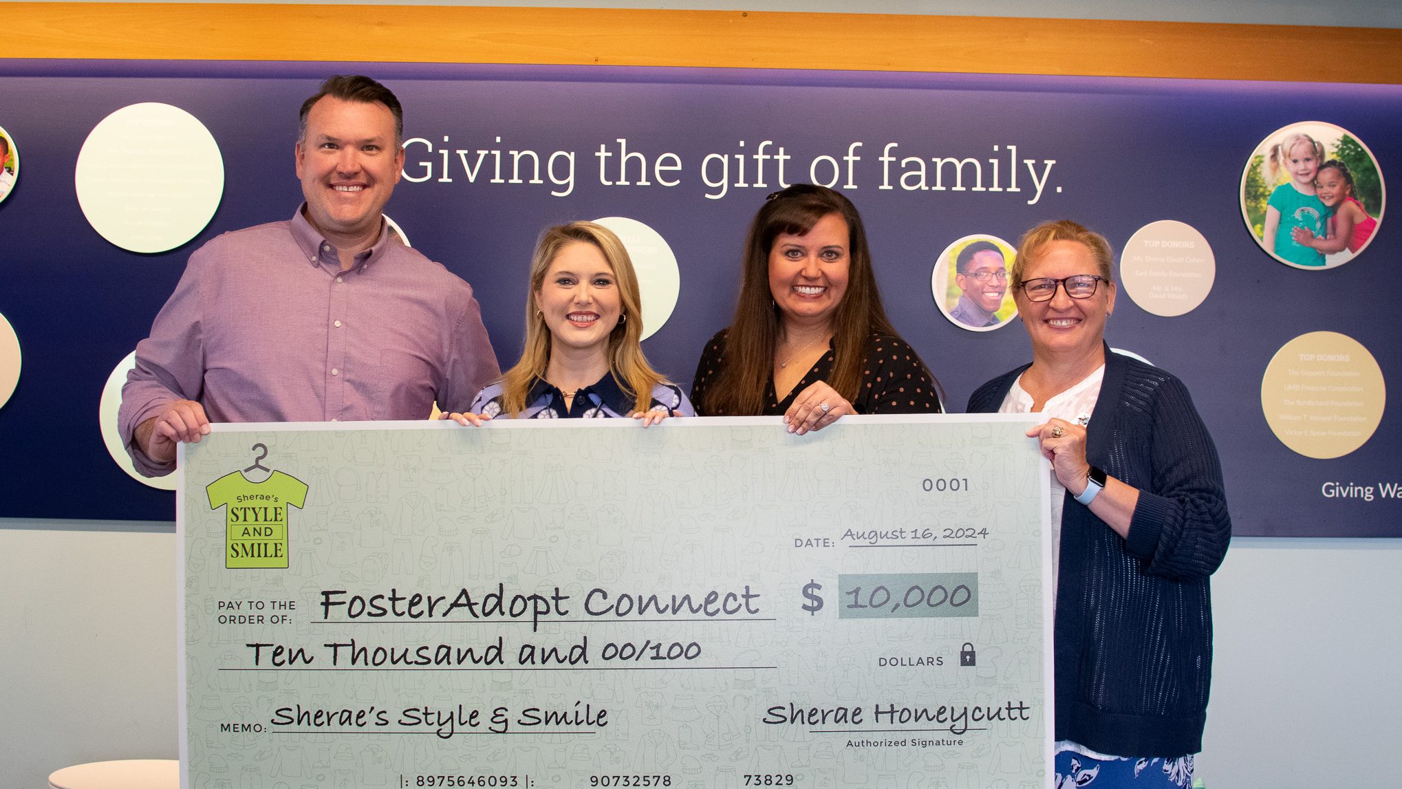 - Logo on our oversized check presented to FosterAdopt Connect